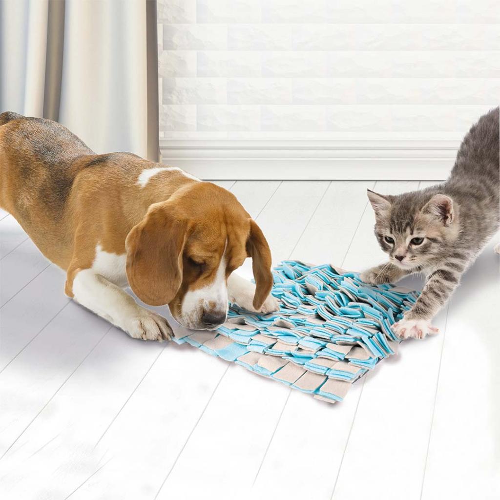 De Duvo+ Snack Mat voor Honden en Katten is een zachte mat van stroke fleece stof waar je makkelijk snacks of brokjes in kunt verstoppen. Je hond of kat gaat op zoek naar de lekkernijen, wat zorgt voor mentale uitdaging, spel en plezier. Het snuffelen past bij het natuurlijke gedrag van je huisdier en geeft een voldaan gevoel. De snack mat helpt ook om je huisdier rustiger te laten eten. Dankzij het zachte materiaal is de mat comfortabel en veilig voor honden en katten van alle leeftijden. Deze mat is perfect als hondenspeelgoed, kattenspeelgoed of traktatiespeelmat, binnen of buiten, en houdt je huisdier actief en gelukkig.